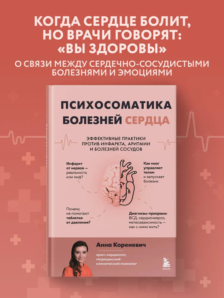 Ваше сердце в порядке, но неприятные ощущения не проходят? Эта книга поможет разобраться, почему так происходит. Автор — опытный кардиолог и психолог Анна Кореневич — простыми словами объясняет, как наше эмоциональное состояние влияет на здоровье сердца. Вы узнаете, откуда берутся "беспричинные" боли, скачки давления и учащенное сердцебиение, и что с этим делать.